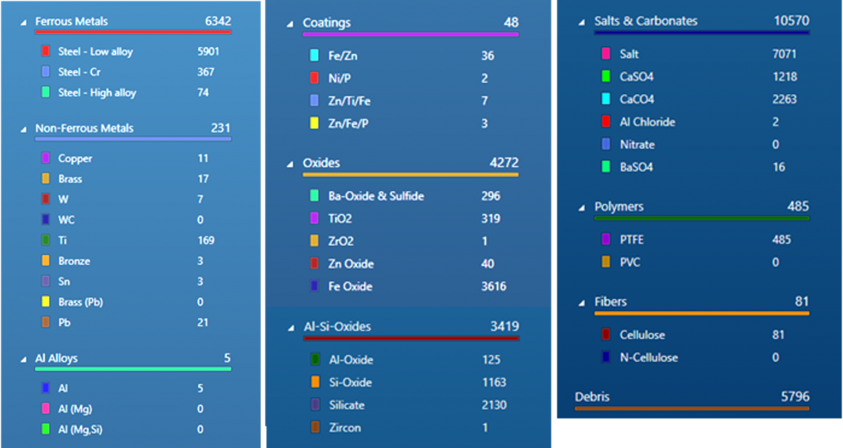 AZtecClean allows you to analyse your sample in SEM in an automatic way. The basic approach used is to locate where a particle is, measure its morphology and composition, combine this information to classify it and repeat for all other particles. It then builds up a big picture of a large population of particles. An example is shown below: