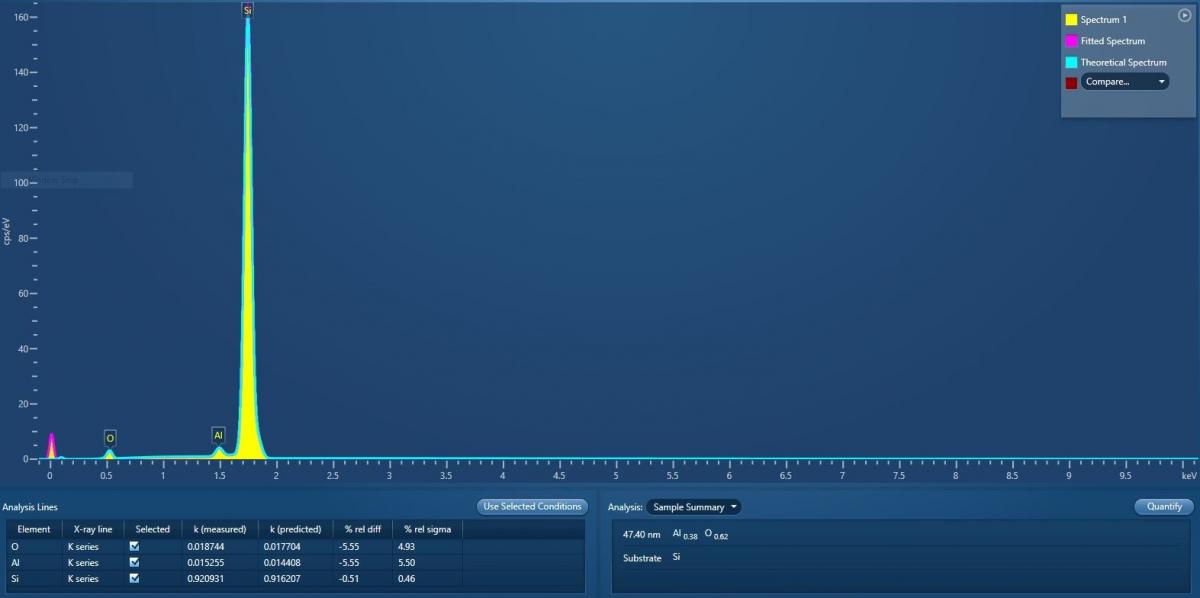 You can see, to the bottom right of the spectrum, that I also have the LayerProbe solution – the thickness of the layer has been calculated as 47.4nm thick and the proportions of Al and O in the layer have been determined to be 38 and 62At% respectively. We also have a measure of the error in this measurement. It really is very straightforward to get a result.