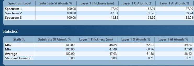 Having done this for one point, the natural tendency is then to go and do it for multiple points across a sample so that we can get an understanding of how the layer thickness and composition varies. In the table below, you can see an example of where we have done this for 3 points across the sample – but you could do this for hundreds of spectra.
