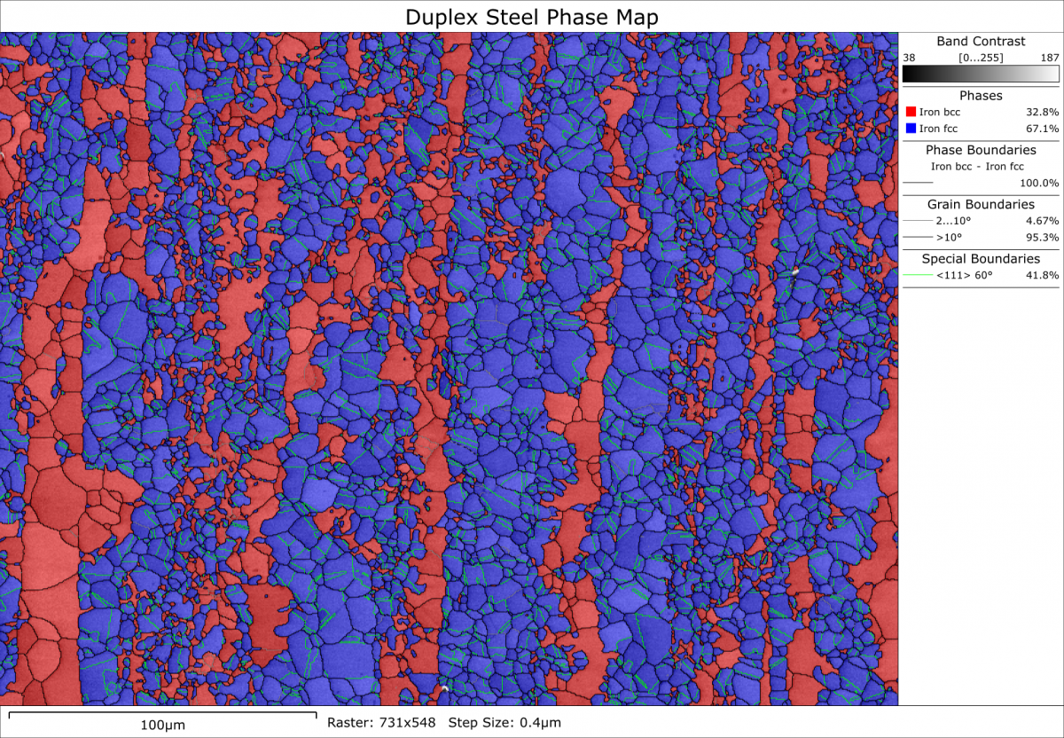 EBSD phase map from a duplex steel sample, collected using the Symmetry S2 detector in only 84 seconds.