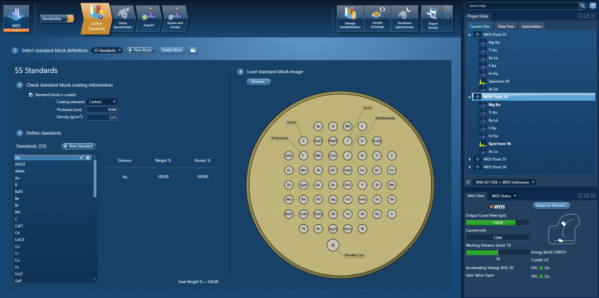 So what is so special about these new products? For our new WDS system, AZtecWave, it is the intelligent way in which the power of a fully-focussing WDS detector (as used on dedicated electron microprobe systems) is incorporated into the speed and convenience of our latest energy dispersive X-ray spectrometry (EDS) system, AZtecLive. This makes it the only system to achieve true microprobe-WDS spectral resolution on an SEM. We are increasingly confident that the significant work that we have put into the quantification “Tru-Q” algorithms in our EDS software enables us to analyse major element compositions with WDS-precision. However, when there exists a significant X-ray peak overlap or when you need to measure trace element compositions, then you need the resolution and detection power of WDS. As you can see in the aforementioned video, the demonstration showed how trace elements (in this case Si and Co) required analysis using WDS, and how the software guides the user through the set-up of acquisition times, beam current measurement, background signal collection and quantification. In less than 3 minutes, using a combination of both EDS and WDS, the user has measured the composition of this sample to microprobe precision. For anyone used to using our AZtec interface, the layout is instantly recognisable and intuitive, as shown below, bringing WDS-precision to many laboratories that cannot justify the significant expense required to purchase and manage a full electron microprobe microanalysis system.