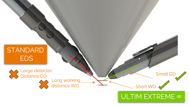 Ultim Extreme ∞ (“Infinity”) is a breakthrough solution for ultra-high resolution FEG-SEM. This unique detector enables EDS data collection at very low kV (e.g. 1-3 kV) and very short working distance to provide elemental analysis under the conditions required to analyse nanomaterials and surfaces at the highest SEM resolution. The maximum sensitivity guaranteed due to specific technological solutions such as: specially shaped sensor, windowless design, proximity of sensor to the sample, small electron trap and very high solid angle.